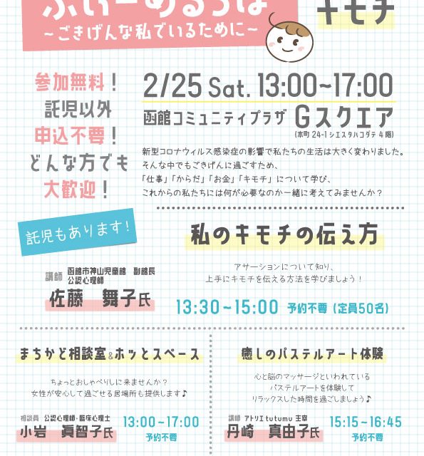 イベント ふぃーめるらぼ~ごきげんな私でいるために~ 2月25日(土) 2月25日(土)函館コミュニティプラザGスクエアで開催の「ふぃーめるらぼ~ごきげんな私でいるために~」をご紹介♪ プレママママ体験 2023.02.03 イベントプレママママ