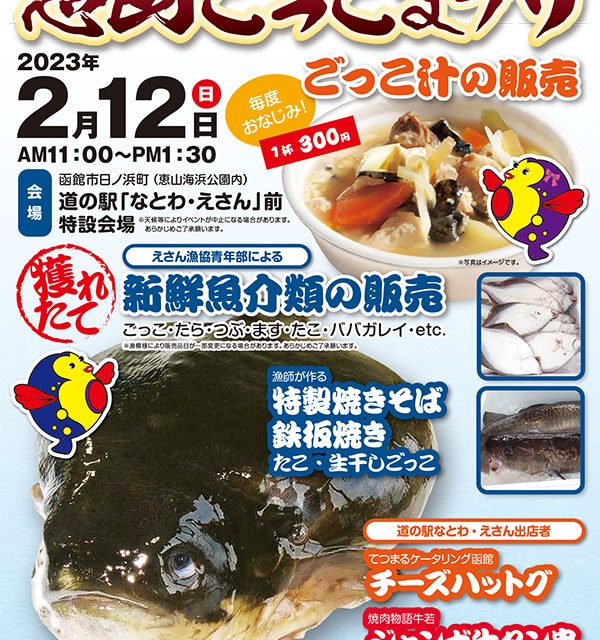 イベント 第31回 恵山ごっこまつり 2月12日(日) 2月12日(日)道の駅なとわ・えさんの特設会場で3年ぶりに【恵山ごっこまつり】開催♪例年大人気のイベントです。冬の味覚をお楽しみに♪ おやこショッピング食べる 2023.01.16 おやこイベント