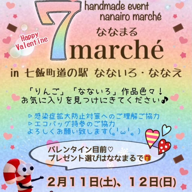 イベント 7marche(ななまる) 2月11日(土)~2月12日(日) 2月11日(土)12日(日)の2日間、道の駅なないろ・ななえで人気のハンドメイドイベント【7marcheななまる】開催~♪バレンタイン直前です!プレゼント探しにいかがでしょうか(^^)/ おやこショッピング 2023.01.16 おやこイベント