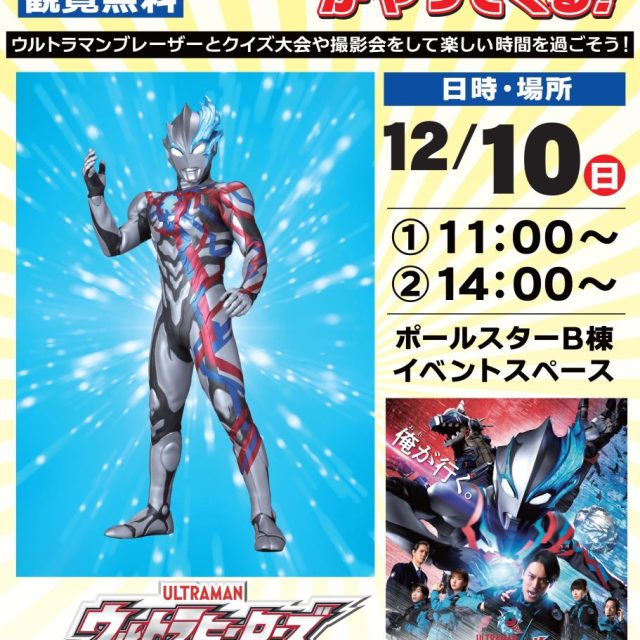 イベント ウルトラマンブレーザーがやってくる! 12月10日(日) 2023年12月10日(日)【ウルトラマンブレーザーがやってくる!】大人気ウルトラヒーローズからブレーザーがポールスターにやってくる!! おやこキッズ見る 2023.11.15 おやこイベントキッズ