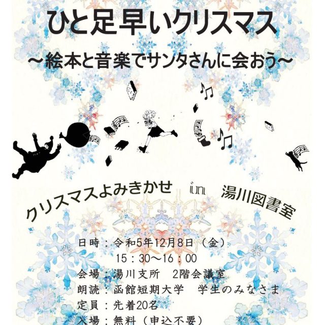 イベント 【湯川図書室】つ・な・が・るおはなし会「クリスマスよみきかせ会」 12月8日(金) 2023年12月8日(金)【湯川図書室】つ・な・が・るおはなし会「クリスマスよみきかせ会」が開催されます♪函館短期大学 保育学科の学生の皆さんによるクリスマス絵本のよみきかせです。 おやこ見る 2023.11.20 おやこイベント