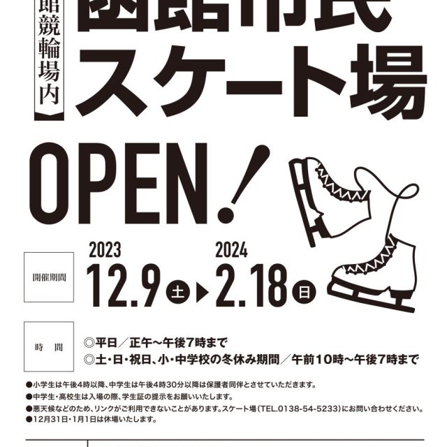 イベント 函館市民スケート場 OPEN! 12月9日(土)~2月18日(日) 12月9日(土)~2月18日(日)函館市民スケート場がオープンします! おやこキッズ体験 2023.12.06 おやこイベントキッズ