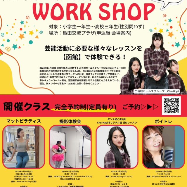イベント ダンス・ボイトレが学べる!ワークショップ 1月13日(土)~2月4日(日) 2024年1月13日(土)・28日(日)・2月4日(日)【ダンス・ボイトレが学べる!ワークショップ】函館のご当地ガールズグループ「Chu-Hapi」が主催の、ボイトレやダンスが学べる無料ワークショップです♪ キッズ学ぶ 2023.12.13 イベントキッズ