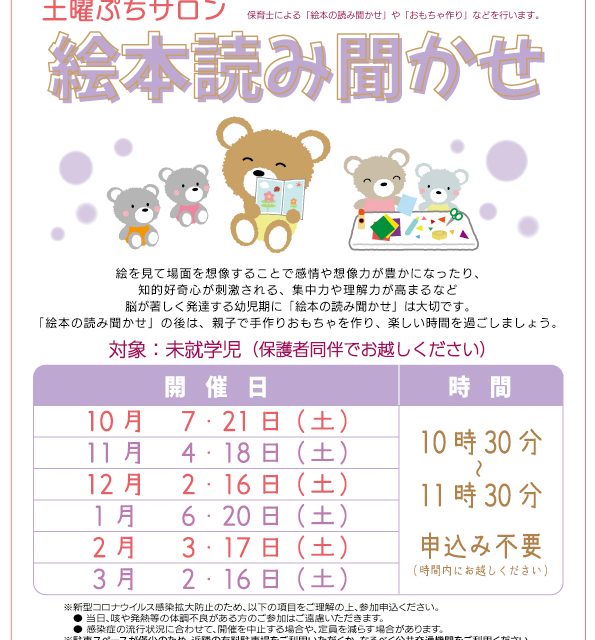 イベント 【函館市女性センター】1月の絵本読み聞かせ 1月6日(土)~1月20日(土) 2024年1月6日(土)20日(土)【函館市女性センター】1月の絵本読み聞かせ 「絵本の読み聞かせ」の後は、親子で手作りおもちゃ作りもしますよ♪ おやこ見る 2023.12.21 おやこイベント
