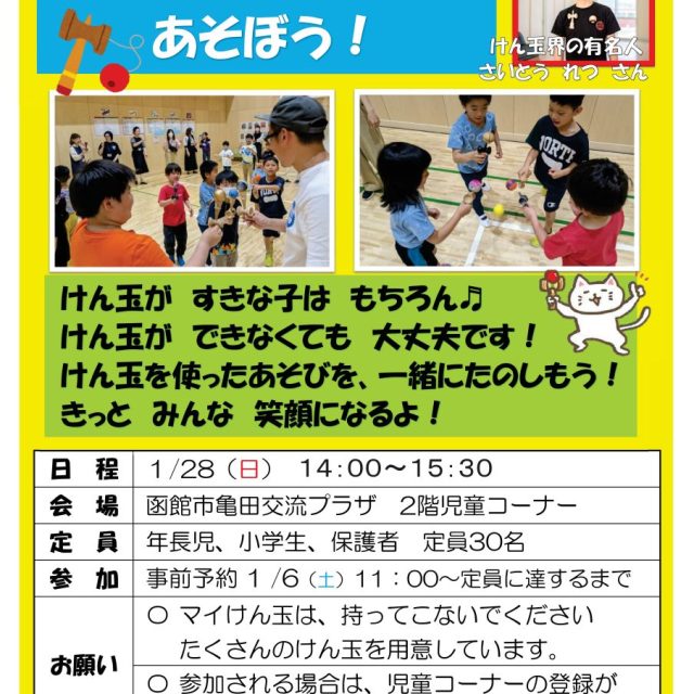 イベント けん玉のケンちゃんとあそぼう! 1月28日(日) 2024年1月28日(日)【けん玉のケンちゃんとあそぼう!】が函館市亀田交流プラザで開催されます♪けん玉界の有名人 斉藤烈さんと一緒にけん玉を楽しもう! おやこキッズ体験 2024.01.05 おやこイベントキッズ