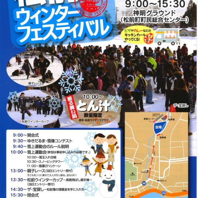 イベント 第2回 松前ウィンターフェスティバル 1月27日(土) 2024年1月27日(土)【松前ウィンターフェスティバル】が開催されます♪雪上運動会、長靴飛ばし選手権、雪中宝探しなどの遊びのほか温かい豚汁やスープなどの振舞いも予定しています。 おやこ体験食べる 2024.01.26 おやこイベント