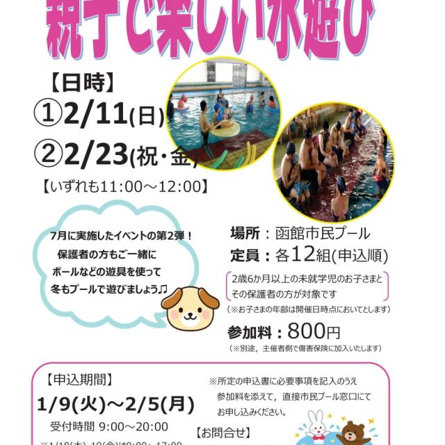 イベント 【函館市民プール】親子で楽しい水遊び 2月11日(日)~2月23日(金) 2024年2月11日(日)・23日(祝・金)【親子で楽しい水遊び】初めて水に入るお子さまでもOK!函館市民プールの親子で楽しい水遊び、お気軽にご参加ください♪ おやこ体験 2024.01.09 おやこイベント