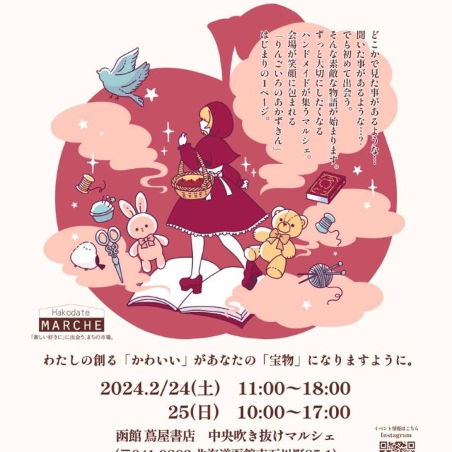 イベント りんごいろのあかずきん 2月24日(土)~2月25日(日) 2024年2月24日(土)25日(日)【りんごいろのあかずきん】函館で活躍中の作家がとっておきの作品と共に大集結! おやこショッピング 2024.02.01 おやこイベント