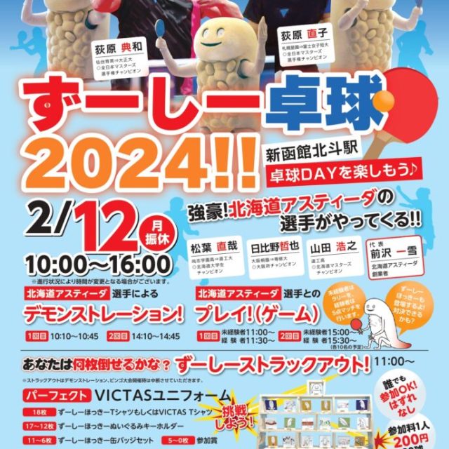 イベント ずーしー卓球2024!! 2月12日(月) 2024年2月12日(月・振休)【ずーしー卓球2024!!】が北斗市観光交流センター別館「ほっくる」で開催されます♪今回のイベントは卓球経験の有無に関わらずご参加いただける企画が盛りだくさんです‼ おやこ体験 2024.02.08 おやこイベント