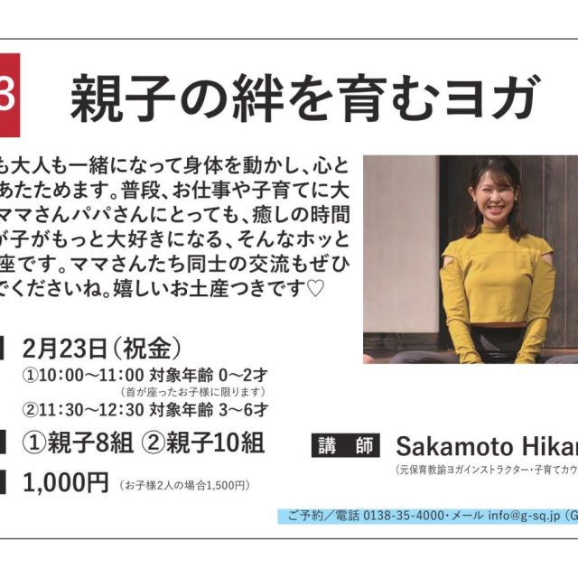 イベント 親子の絆を育むヨガ 2月23日(金) 2024年2月23日(祝金)【親子の絆を育むヨガ】が開催されます♪子どもも大人も一緒になって身体を動かし、心と身体をあたためます。 おやこ体験 2024.02.07 おやこイベント