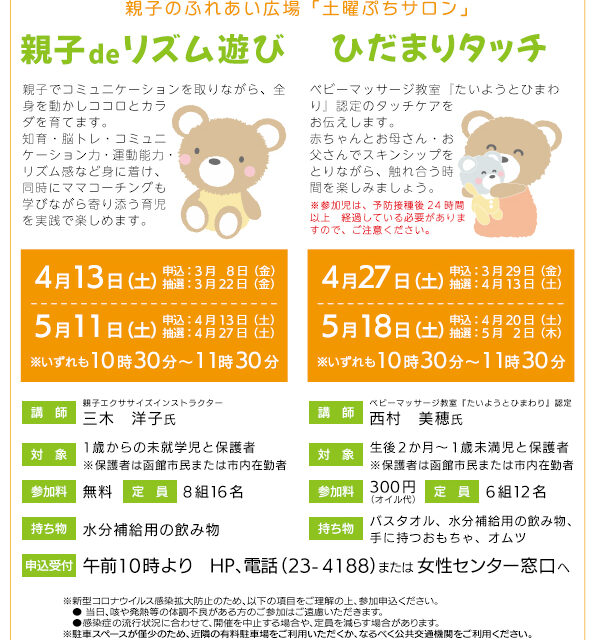 イベント 【函館市女性センター】ひだまりタッチ 4月27日(土) 2024年4月27日(土)【函館市女性センター ひだまりタッチ】が開催されます♪ベビーマッサージ教室「たいようとひまわり」認定のタッチケアをお伝えします。 おやこ体験 2024.03.01 おやこイベント
