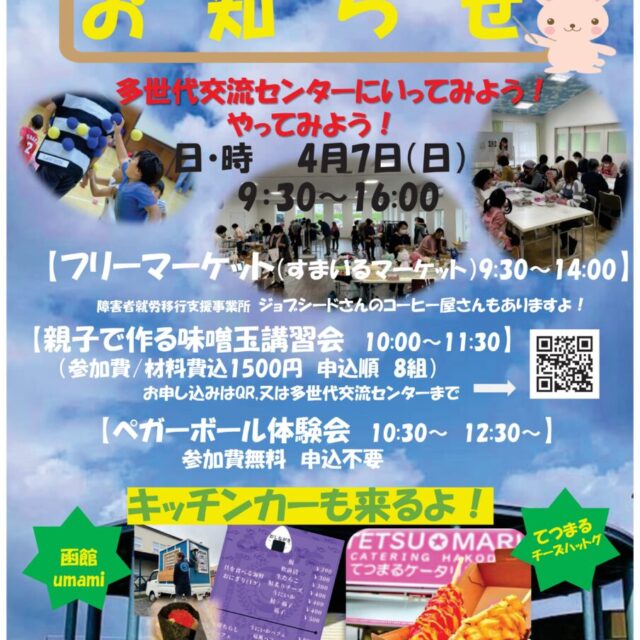 イベント 多世代交流センターにいってみよう!やってみよう! 4月7日(日) 2024年4月7日(日)【多世代交流センターにいってみよう!やってみよう!】フリーマーケットや親子で作る味噌玉講習会、ペガーボール体験会(参加費無料、申込不要)が楽しめる♪キッチンカーも来るよ! おやこショッピング体験 2024.03.21 おやこイベント