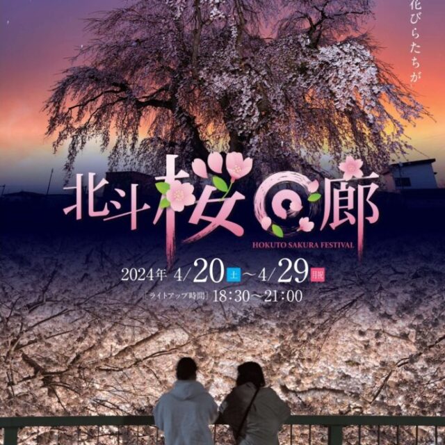 イベント 北斗桜回廊 4月20日(土)~5月6日(月) 2024年4月20日(土)~5月6日(月・振休)【北斗桜回廊】北斗市の美しい桜が幻想的にライトアップされた様子を楽しめます♪ おやこ見る 2024.04.25 おやこイベント