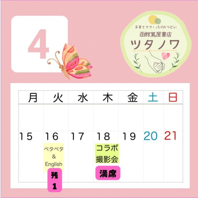イベント 【函館蔦屋書店 ツタノワ】子育てママ・パパのつどい – 4月 – 4月16日(火) 2024年4月16日(火)【函館蔦屋書店 ツタノワ】子育てママ・パパのつどい - 4月 -】函館蔦屋書店で開催される、子育てママ・パパのつどい。”ツタノワ”どんな方でも参加OK!お一人様、お子さまづれでも大歓迎です、お気軽にお問い合わせください♪ おやこ体験 2024.04.10 おやこイベント
