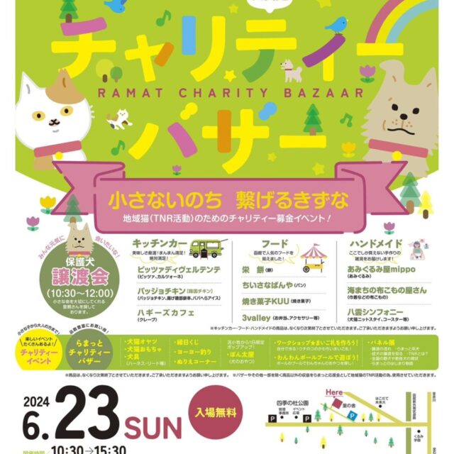 イベント らまっと チャリティーバザー ~小さな命、繋げるきずな~ 6月23日(日) 2024年6月23日(日)【らまっと チャリティーバザー ~小さな命、繋げるきずな~】保護犬・保護猫・地域猫(TNR活動)のためのチャリティー募金イベント。 おやこショッピング食べる 2024.06.13 おやこイベント