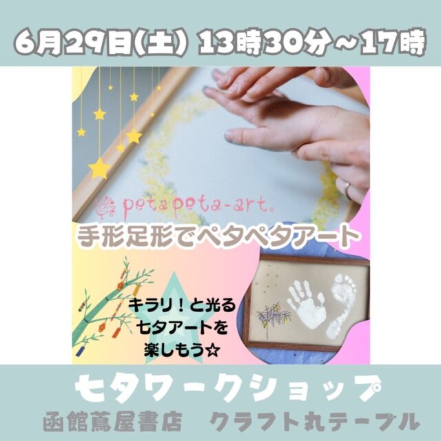 イベント 手形足型でペタペタアート 七夕ワークショップ 6月29日(土) 2024年6月29日(土)【手形足型でペタペタアート 七夕ワークショップ】が函館蔦屋書店で開催されます♪手足形を押した後にぷっくりキラキラに加工する『キラリ手形アート』をしてみませんか? おやこ体験 2024.06.25 おやこイベント