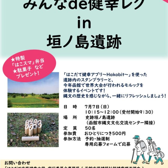 イベント みんなde健幸レクin垣ノ島遺跡 7月7日(日) 開催場所 史跡垣ノ島遺跡「はこだて健幸アプリ~Hakobit~」を使った遺跡内のスタンプラリーと、今年8月に函館で世界大会が行われるモルックを体験するイベントです。小学生以上のお子様とのご参加も大歓迎です!南茅部の世界遺産「垣ノ島遺跡」で縄... おやこキッズ体験 2024.06.12 おやこイベントキッズ