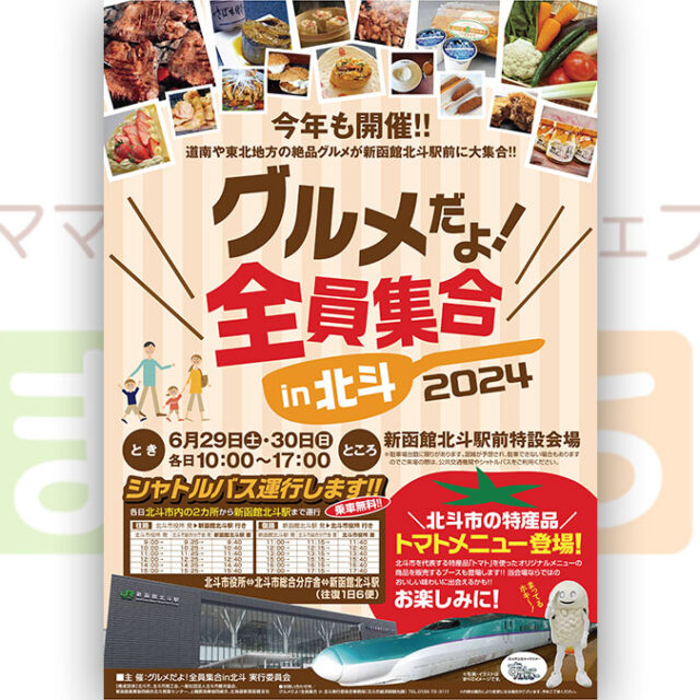 イベント グルメだよ!全員集合 in 北斗 2024 6月29日(土)~6月30日(日) 2024年6月29日(土)~30日(日)【グルメだよ!全員集合 in 北斗 2024】が開催されます♪道南や東北地方の絶品グルメが新函館北斗駅前に集結します! おやこショッピング食べる 2024.06.26 おやこイベント