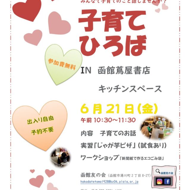 イベント 【函館友の会】子育てひろばin函館蔦屋書店 6月21日(金) 2024年6月21日(金)【函館友の会】子育てひろばin函館蔦屋書店 子育てのお話しをしたり、試食ありの実習料理や、「新聞紙で作るエコごみ袋」のワークショップなどみんなで楽しく交流できます♪ おやこ作る 2024.06.13 おやこイベント