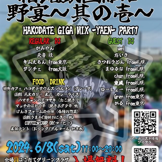イベント 野外アニソンDJイベント 箱館戯画融合 野宴~其の壱~ 6月8日(土) 2024年6月8日(土)【野外アニソンDJイベント 箱館戯画融合 野宴~其の壱~】がはこだてグリーンプラザで開催されます!アニソンDJによるリズムで親子で踊ろう!! おやこ体験見る食べる 2024.06.07 おやこイベント