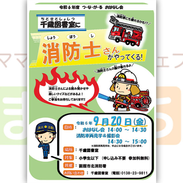 イベント 千歳図書室に消防士さんがやってくる! 9月20日(金) 2024年9月20日(金)【千歳図書室に消防士さんがやってくる!】が開催されます♪消防士さんによる読み聞かせや楽しいクイズなどがあるよ! おやこ体験 2024.08.27 おやこイベント