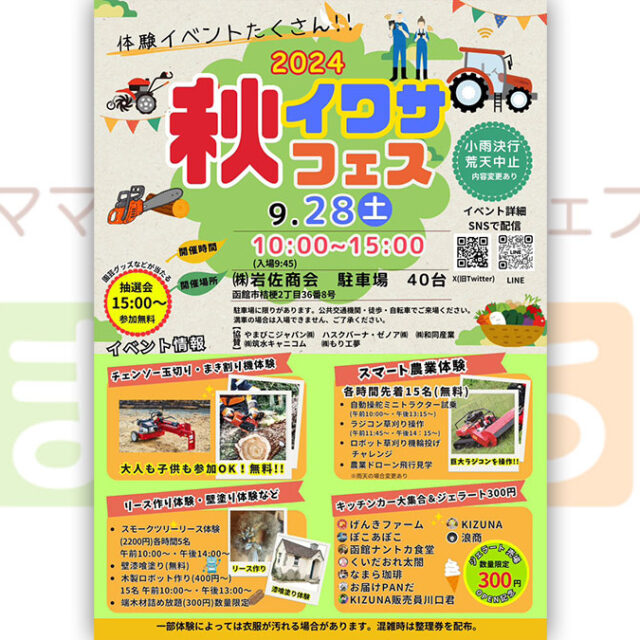 イベント 北斗市商工観光まつりin八郎沼 9月22日(日) 2024年9月22日(日)【北斗市商工観光まつりin八郎沼】が開催されます♪自然豊かな市民の憩いの場「八郎沼公園」にて、特産品販売やおいしいフード出店が集結します! おやこ見る遊び食べる 2024.09.13 おやこイベント