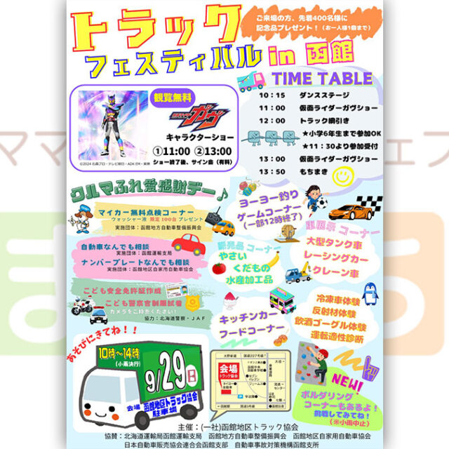 イベント トラック☆フェスティバル ㏌ 函館 9月29日(日) 2024年9月29日(日)【トラック☆フェスティバル ㏌ 函館】が開催されます♪キャラクターショーや車展示、ダンプカーとの綱引き大会など盛りだくさん♪ おやこショッピング体験食べる 2024.09.12 おやこイベント