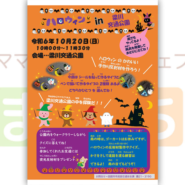 イベント ハロウィンin梁川交通公園 10月20日(日) 2024年10月20日(日)【ハロウィンin梁川交通公園】が開催されます♪公園内をウォークラリーしながらクイズに答えてね♪ おやこ体験 2024.10.08 おやこイベント