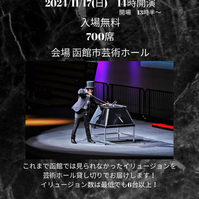 イベント 高野太吾プレゼンツ スペシャルイリュージョンショー 11月17日(日) 2024/11/17(日)【イリュージョンショー】道南最大規模のイリュージョンショーを芸術ホールで! おやこ見る 2024.05.15 おやこイベント