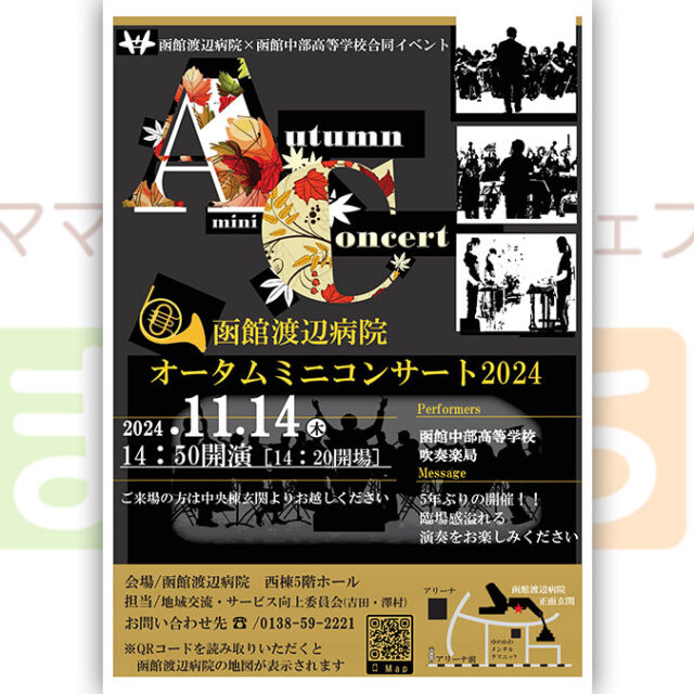 イベント 函館渡辺病院 オータムミニコンサート2024 11月14日(木) 2024年11月14日(木)【函館渡辺病院 オータムミニコンサート2024】が開催されます♪函館中部高等学校 吹奏楽局による臨場感あふれる演奏をお楽しみください♪ おやこ見る 2024.10.09 おやこイベント