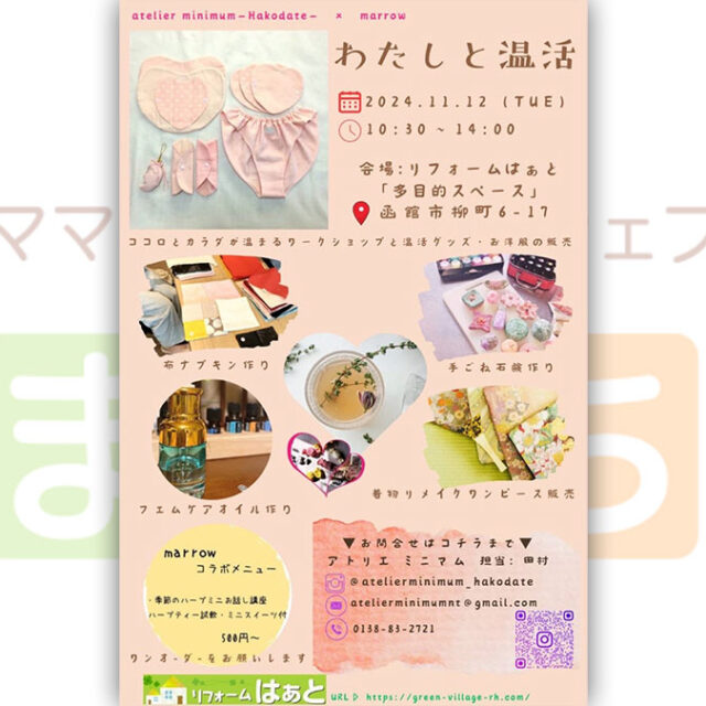 イベント わたしと温活 11月12日(火) 2024年11月12日(火)【あたしと温活】ココロとカラダが温まるワークショップと温活グッズ・お洋服の販売イベントです♪ ママショッピング作る食べる 2024.11.05 イベントママ