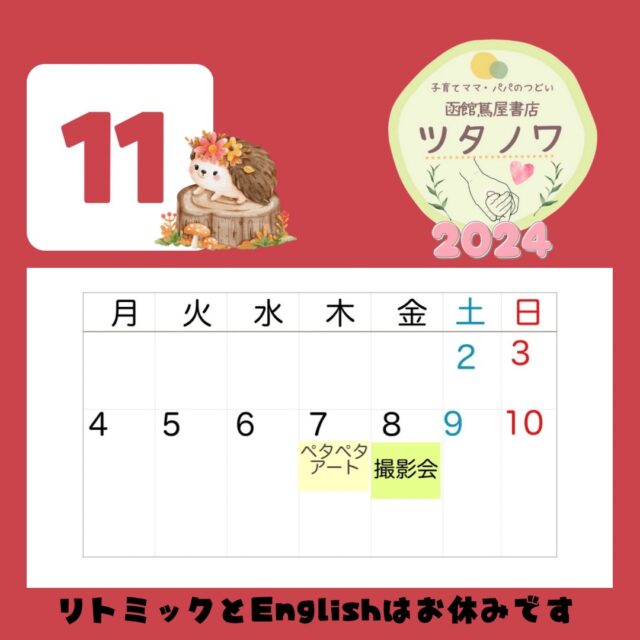 イベント 【函館蔦屋書店 ツタノワ】子育てママ・パパのつどい – 11月 – 11月7日(木)~11月8日(金) 【函館蔦屋書店 ツタノワ】子育てママ・パパのつどい - 11月 -】函館蔦屋書店で開催される、子育てママ・パパのつどい。”ツタノワ”どんな方でも参加OK!お一人様、お子さまづれでも大歓迎です、お気軽にお問い合わせください♪ おやこ体験 2024.11.01 おやこイベント