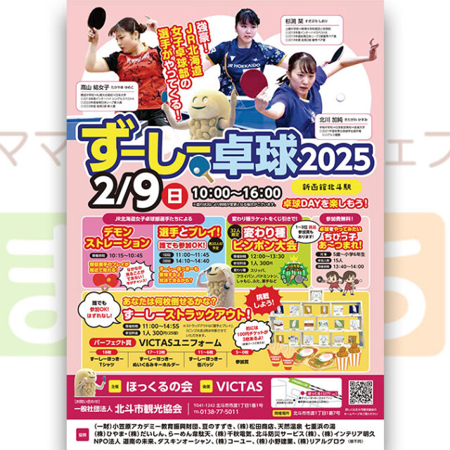 イベント ずーしー卓球2025 2月9日(日) 2024年2月9日(日)【ずーしー卓球2025】開催! 現役卓球選手のプレイが間近で見られる!ビンゴ大会や飲食ブースも♪ おやこ体験 2025.01.22 おやこイベント
