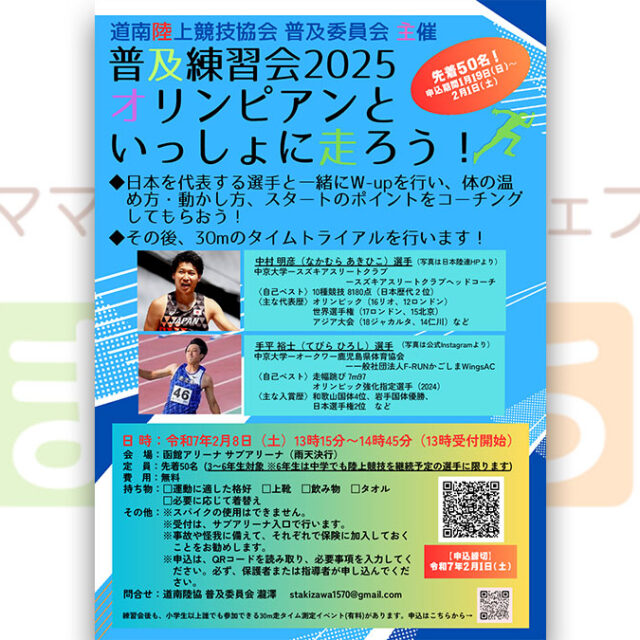 イベント 【道南陸上競技会】オリンピアンといっしょに走ろう! 2月8日(土) 2025年2月8日(土)【オリンピアンといっしょに走ろう!】が開催されます♪日本を代表する選手にコーチングしてもらおう! キッズ体験 2025.01.30 イベントキッズ