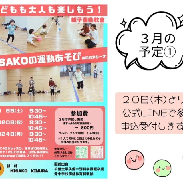 イベント 子どもも大人も楽しもう!HISAKOの運動あそび 3月6日(木)~3月25日(火) 2025年3月~【子どもも大人も楽しもう!HISAKOの運動あそび】が開催されます♪公式LINEにて申込み受付スタート! おやこ体験 2025.02.25 おやこイベント