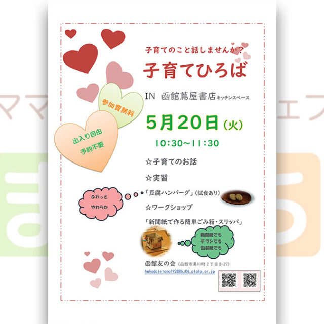 2025年5月20日(火)【函館友の会】子育てひろばin函館蔦屋書店が開催されます♪子育ての話をしたり、試食ありの料理実習(今回は豆腐ハンバーグ!)などみんなで楽しく交流できます♪