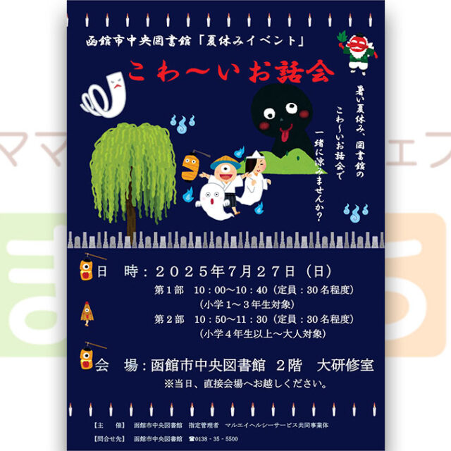イベント 【函館市中央図書館】こわ~いお話会 7月27日(日) 開催場所 函館市中央図書館 2階 大研修室函館市中央図書館「夏休みイベント」暑い夏休み、図書館のこわ~いお話会で一緒に涼みませんか?第1部 10:00~10:40(定員:30名程度)対象 小学1~3年生第2部 10:50~11:30(定員:... おやこキッズ 2025.07.18 おやこイベントキッズ