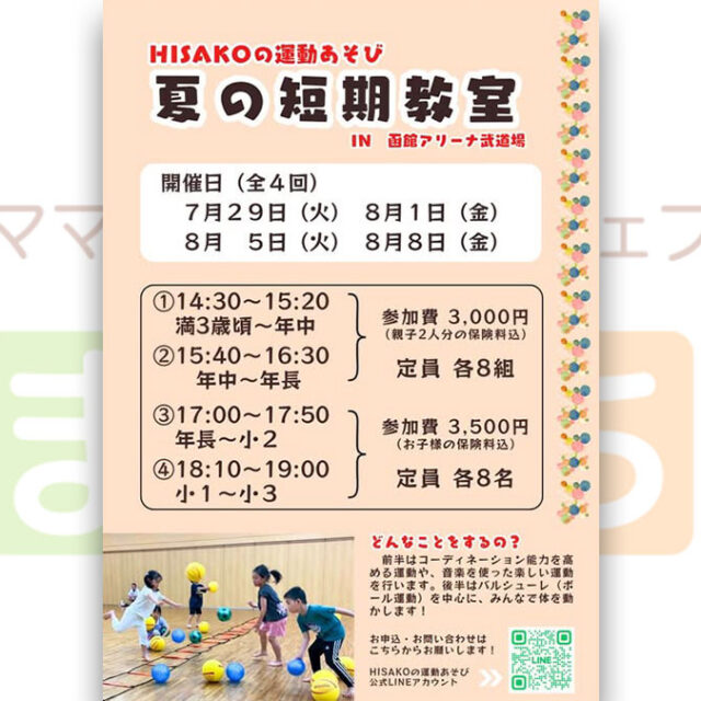 イベント 【HISAKOの運動あそび】夏の短期教室 7月29日(火)~8月8日(金) 開催場所 函館アリーナ武道場どんなことをするの?前半はコーディネーション能力を高める運動や、音楽を使った楽しい運動を行います。後半はバルシューレ(ボール運動)を中心に、みんなで体を動かします!※満席のクラスもありますので詳しくはInstag... おやこ体験 2025.07.08 おやこイベント