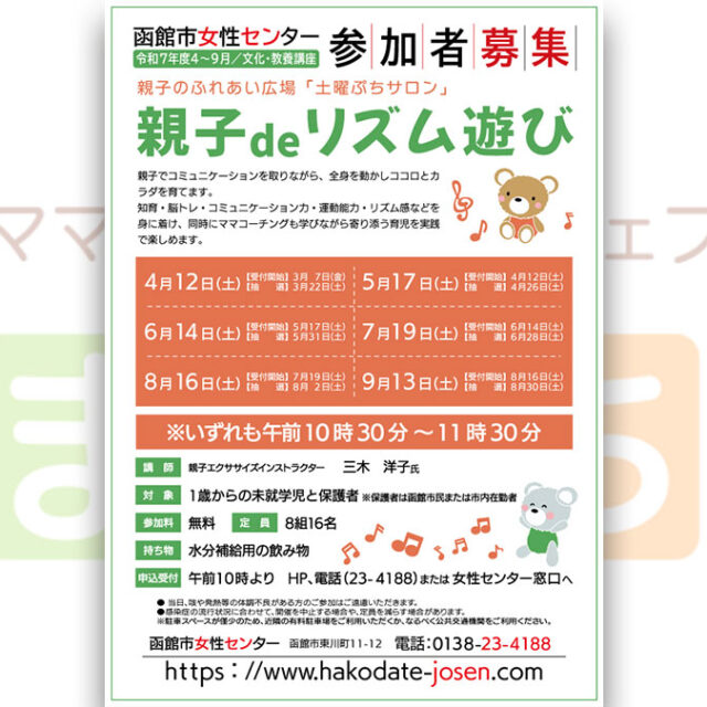 イベント 【函館市女性センター】親子deリズム遊び(9月) 9月13日(土) 【函館市女性センター 親子deリズム遊び】が開催されます♪親子でコミュニケーションを取りながら、全身を動かしココロとカラダを育てます。 おやこ体験 2025.08.01 おやこイベント