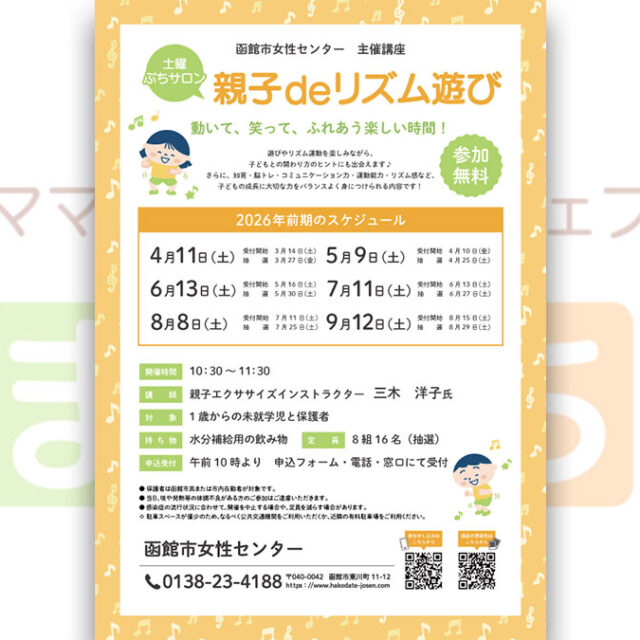 【函館市女性センター 親子deリズム遊び】が開催されます♪親子でコミュニケーションを取りながら、全身を動かしココロとカラダを育てます。