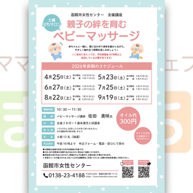 【函館市女性センター】親子の絆を育むベビーマッサージ(4月)