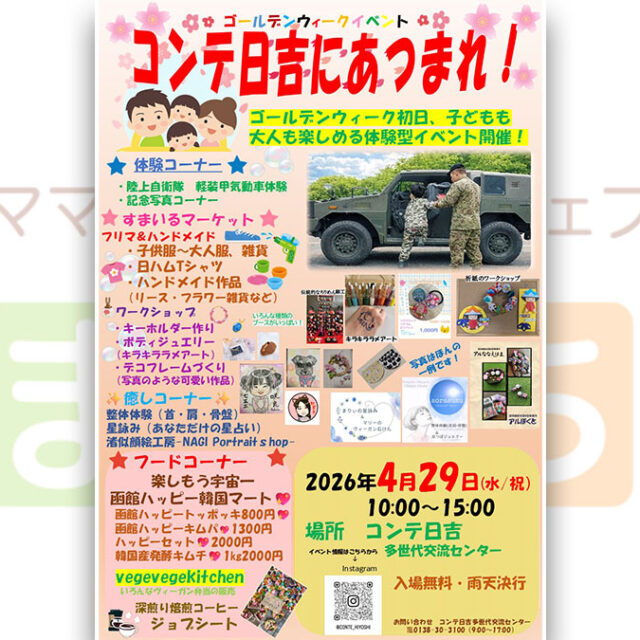 2026年4月に函館・近郊で開催される、おやこ・ママ・パパ・キッズ・プレママ向けのイベント情報をママスタッフが集めてきました♪