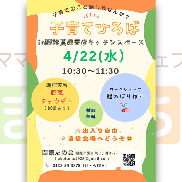 2026年4月22日(水)【函館友の会】子育てひろばin函館蔦屋書店キッチンスペースが開催♪子育ての話をしたり、試食ありの料理実習(今回は野菜チャウダー!)などみんなで楽しく交流できます♪