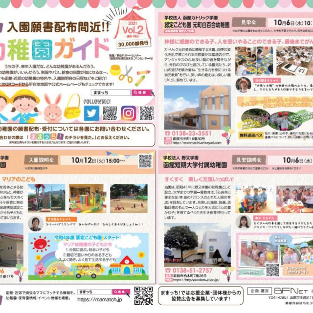 お知らせ 2021年版【幼稚園ガイド折込チラシ Vol.2】をウェブ上でも♪ vol.1に引き続き、ままっち!2021年度版【幼稚園ガイドvol.2】折込チラシをウェブ上でもご覧いただけるようにページを開設しました!是非お役立てください♪ 2021.09.13 お知らせ