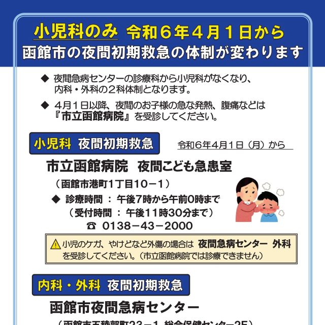令和6年4月1日から、函館市の小児科の夜間初期救急体制が変わります。