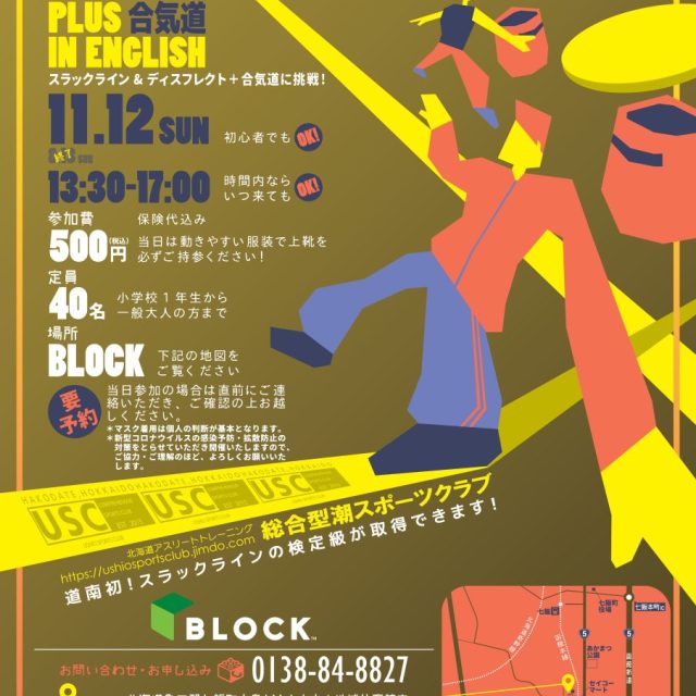 イベント SLACKLINE(スラックライン)&DISCFLECT(ディスフレクト)英語で合気道 11月12日(日) 2023年11月12日㈰【SLACKLINE(スラックライン)&DISCFLECT(ディスフレクト)英語で合気道】歌って踊ってゲームをして遊びながら英語を覚えるイベントです。 おやこキッズ体験学ぶ 2023.11.08 おやこイベントキッズ