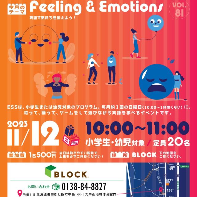 イベント イングリッシュ サンデー スクール 11月12日(日) 2023年11月12日㈰【イングリッシュ サンデー スクール】今回のテーマは「"Feeling & Emotion"」みんなで体を動かしながら楽しく英語を学ぼう! おやこキッズ体験学ぶ 2023.11.08 おやこイベントキッズ