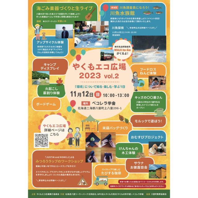 イベント やくもエコ広場2023 vol.2 11月12日(日) 2023年11月12日㈰【やくもエコ広場2023 vol.2】やくもエコ広場は八雲町にて開催する、環境について考える・学ぶことを目的とした子どもから大人まで楽しめる要素モリモリのイベントです♪ おやこ体験作る学ぶ食べる 2023.11.09 おやこイベント