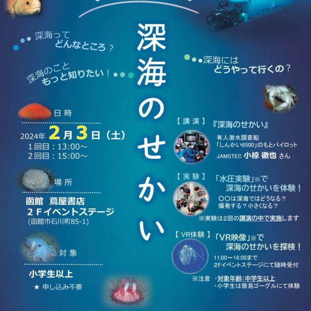 イベント 深海のせかい 2月3日(土) 2024年2月3日(土)【深海のせかい】が函館蔦屋書店で開催されます♪有人潜水調査船「しんかい6500」の元パイロットによる講演のほか、水圧実験、VR体験など。 おやこ体験学ぶ 2024.01.29 おやこイベント