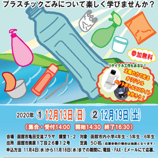 2020年12月13日(日)・19日(土)【プラごみを学ぼう!】が函館市亀田交流プラザにて開催されます♪太陽の力で光るオリジナルペットボトルエコライトを作ろう!
